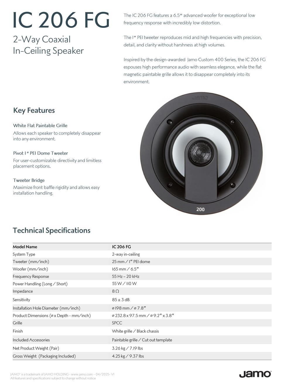 IC 206 FG采用了1只6.5”注塑石墨低音单元带来几乎没有失真的超低频率响应。1只1“复合球顶高音单元用以再现精准、富有细节的纯净中高音声效,且不会在高音量播放时感到刺耳。