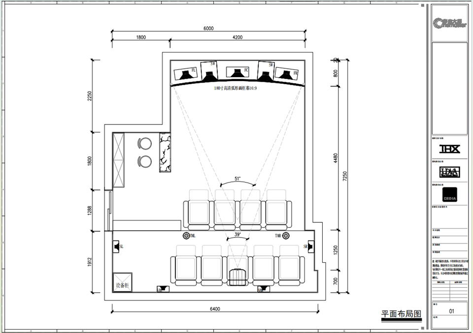 前方左面设计洗手台,右方为180寸弧形投影幕