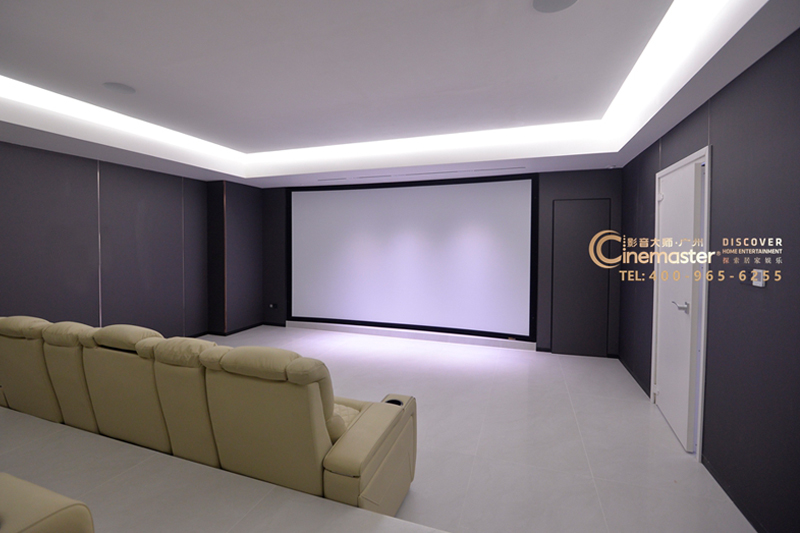 观看距离更是惊喜:7m 长度中,幕布到首排座椅留足 5m 间距,既不会因距离过近导致视觉压迫,也不会因过远削弱沉浸感。层高方面,地下室原始 2.8m 净高,刚好达到 CEDIA 国际标准的临界点,嵌入式音箱 + 10cm 吸音层安装后仍有余,完全不压抑。
