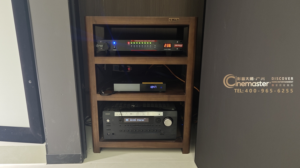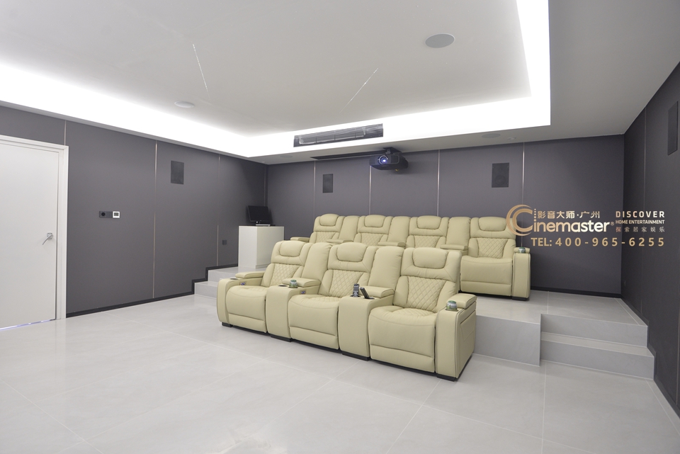 在房间屏幕右侧 0.8m 宽独立设备间(净深 60cm 满足机柜散热需求),把播放器,功放等主机等设备全部收纳,既减少运行噪音,又让观影区保持整洁。声学处理上,墙面用浅灰布艺吸音板+硬包,针对性解决中高频吸音问题。