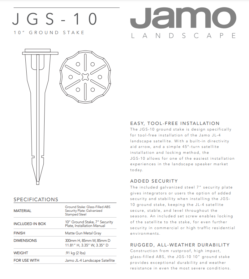 JGS-10地桩是专门为无工具安装的Jamo JL-4Landscape系列卫星音箱而设计的。内置指向性辅助箭头,采用了简单的45°旋转卫星安装和锁定方法,在如今户外景观音箱市场中,JGS-10是目前景观扬声器市场上安装起来更为简单的音箱配件之一。