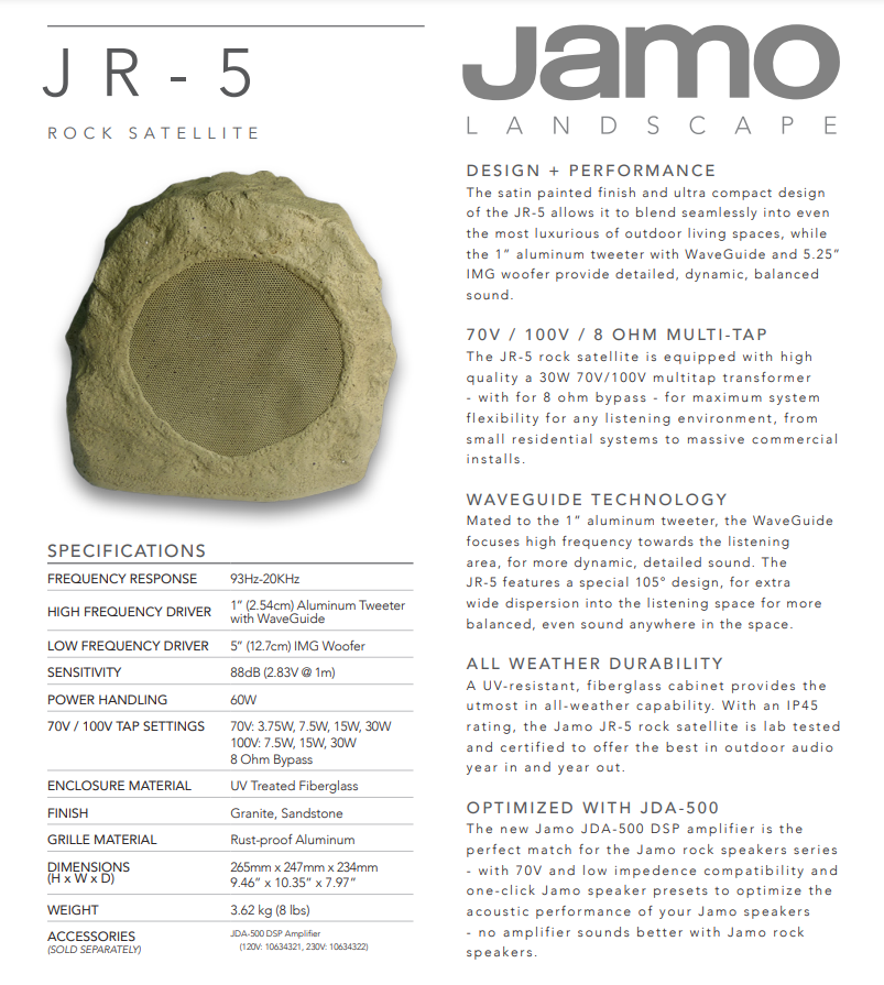 防紫外线的玻璃纤维箱体在各种气候环境之下都能表现良好。具有IP45评级的Jamo JR-5岩石卫星箱经过实验室的验证,能年复一年的提供更为出色的户外音响声效。