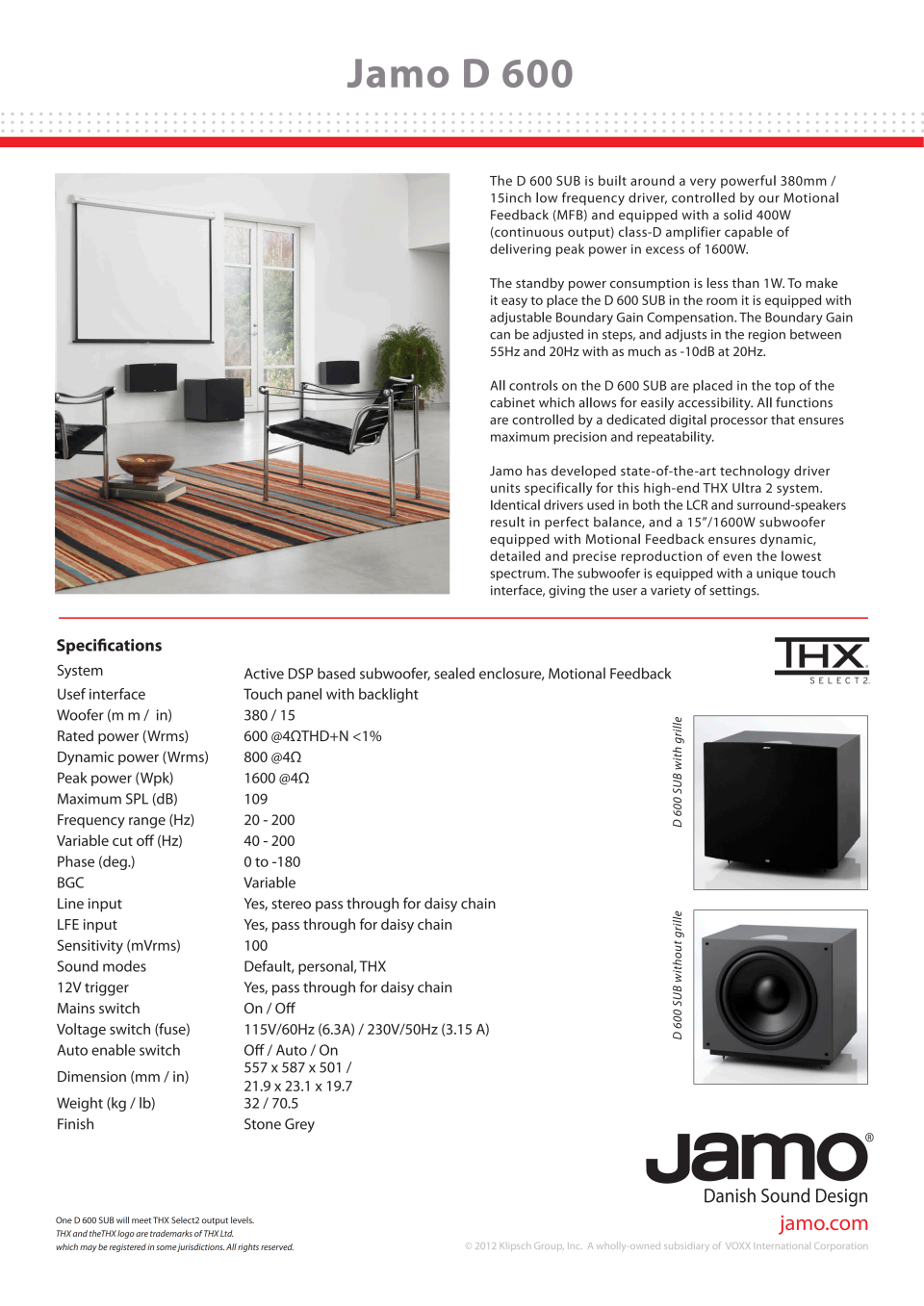 D 600 SUB采用一个非常强劲的15” 低音单元,采用我们独有的 Motional Feed Back (MFB动态反馈),幷配有一个结实的400W (连续输出)D类放大器,能传递1600W的峰值功率。待机消耗小于1W。为使D 600 SUB在房间内更容易摆放,另外还配备了BGC边界增益补偿线路。BGC边界增益能同步可调,并可在55Hz和20Hz 之间调整,差不多在20Hz可调-10dB。在D 600 SUB上面的所有控制器都放置在箱体的顶部,很容易操作。所有的功能被一个专门的数字信息处理器所控制,以确保最大程度上的精确性和还原性。