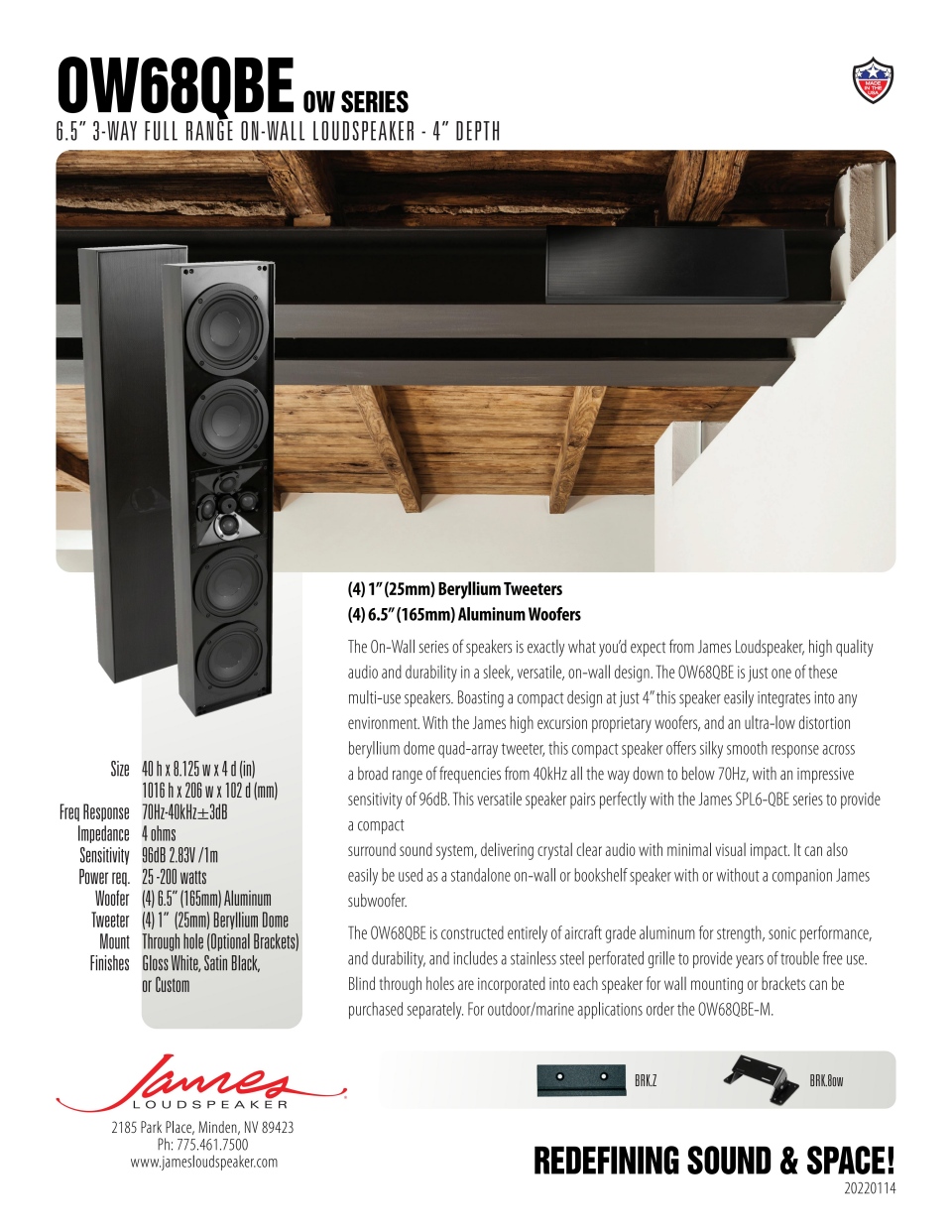 OW68QBE墙上扬声器配备四个专有的6.5英寸低音单元,低频可达70Hz,以及四个1英寸铍顶高音单元,最高可达40kHz。采用James设计的网络,确保驱动单元间无缝切换,在任何听音环境中都能提供出色的性能。