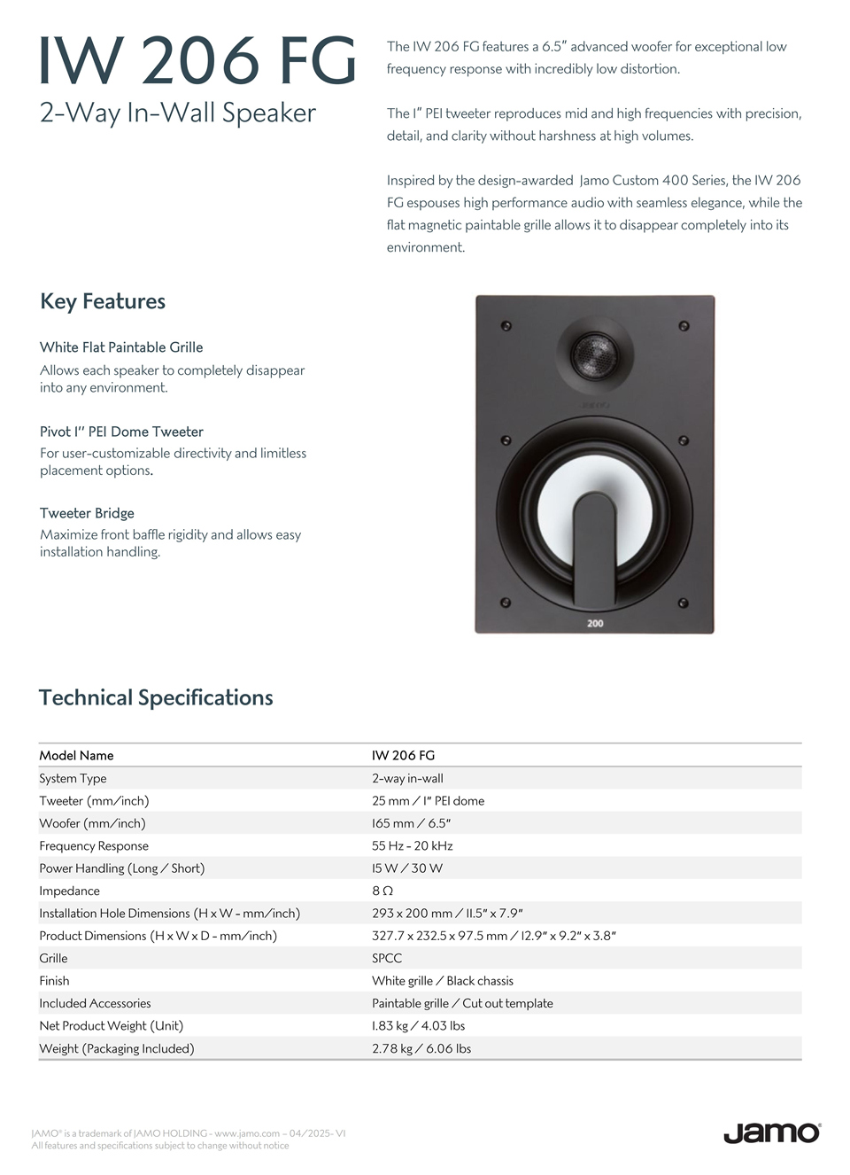 从Jamo 400定制系列那屡获殊荣的工业设计中获得灵感,IW 206 FG具备高性能音频技术与出色的箱体设计,而表面平坦的磁吸式可喷涂网罩让它完全消失在安装环境之中。这是一个强大的音箱,适合用于那些您真的想大声播放音乐的、空间更大的客厅或房间。