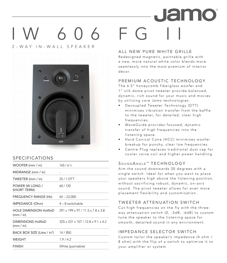 采用了Jamo核心技术的6.5” HCC硬锥盆低音单元和1”丝膜球顶可旋转高音单元能为您的音乐和电影带来平衡、动态且细节丰富的杰出声效: