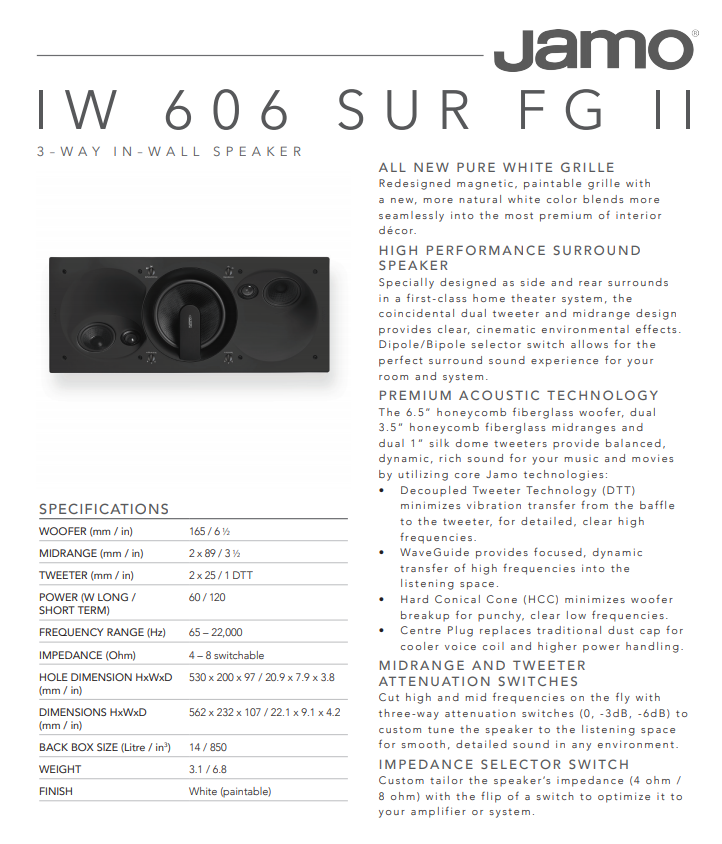 采用了Jamo核心技术的6.5” HCC硬锥盆低音单元;2×3.5” HCC硬锥盆中音单元和2×1”丝膜球顶可旋转高音单元能为您的音乐和电影带来平衡、动态且细节丰富的声音: