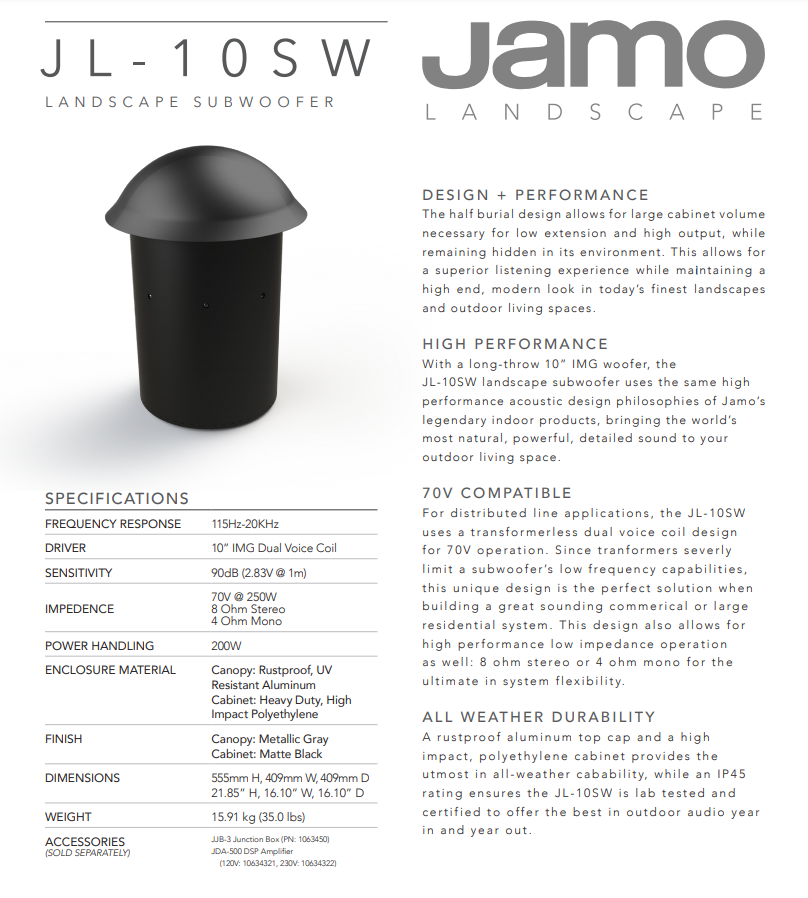 半埋式设计获得大容量箱体容积可满足低频延伸和高输出的要求,而仍能在安装环境中隐藏不见。这款JL10SW 能让人获得出色的音乐体验,并且在当下优美的风景处和室外生活空间中保持高端的,现代的观感。